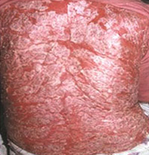 诊治解析:红皮病型牛皮癣症状 1、多有急性进行期寻常型银屑病受刺激等处理不当或脓胞型银屑病历史; 2、全身潮红,大量脱屑;